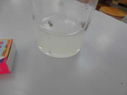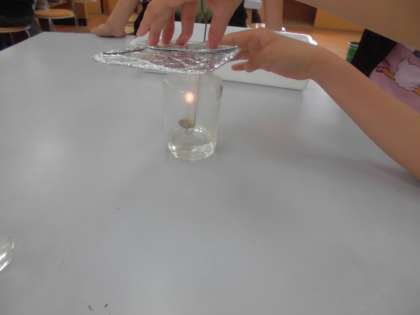 ものの燃え方の単元の学習をしています。ものが燃える前と燃えた後の空気の違いについて,石灰水を使って実験をしました。ローソクが燃えた後のびんの中に石灰水を入れて振ると,石灰水が白く濁りました。その結果から,びんの中の空気は二酸化炭素が増えていることがわかりました。