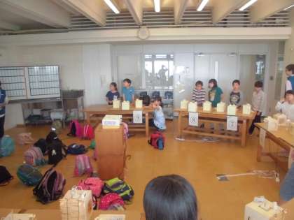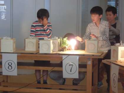 次にクラスごとに分かれて実験の学習をしました。2組の子どもたちはすだれやグリーンカーテンを使うことによって夏の室内がどのぐらい涼しくなるかについて実験をしました。