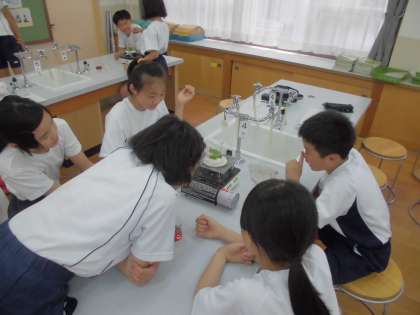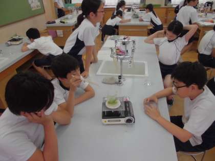 ジャガイモの葉に日光が当たるとでんぷんができるかどうかについて実験をしました。ジャガイモの葉をゆでて柔らかくしてから,ヨウ素液ででんぷんがあるかを確かめました。残念ながら朝から日光が出ず葉にでんぷんができることをを確かめることができませんでした。