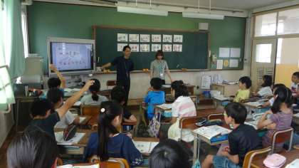 ALTの先生との学習です。先生が発する言葉をよく聞きながら,学習に取り組んでいます。