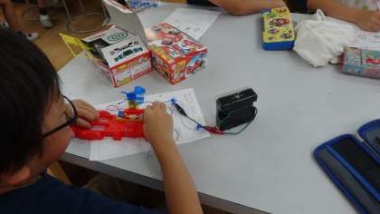 「電池のはたらき」を学習しています。今日は簡易検流計を使って,電流の強さを調べました。