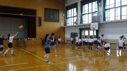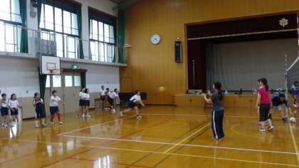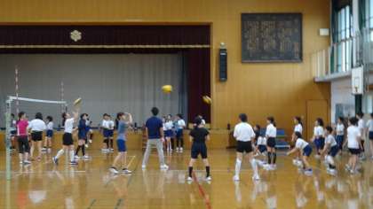 バレーボール部の練習の様子です。バレーボール部は今年度40名を超える入部がありました。地域の方々にもお手伝いをいただきながら,頑張って練習しています。