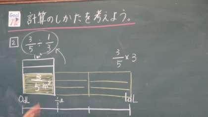 分数のわり算を学習しています。計算の意味を面積図を使って考えました。