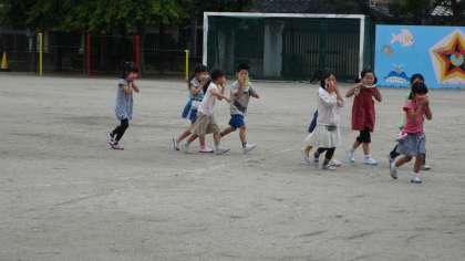 教室から運動場へ避難してくる様子です。ハンカチで鼻や口を押えて,しゃべらずに避難します。いざという時,落ち着いて行動できるようにしたいです。