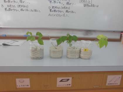 「植物の成長」の学習をしています。「植物の成長に日光や肥料が関係しているか。」について,10日前に準備しておいたインゲン豆の苗の成長について確かめました。日光を当て,肥料を与えた苗が大きく成長していていました。