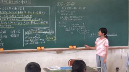 「同じものに目をつけて」の学習です。文章題を読んで問題を考えていきます。「同じもの」は何かを考えて解いていくことがポイントです。自分が考えたことはお互いに交流し,考えを深めていきました。