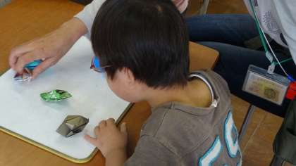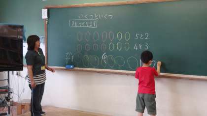 1年生の授業の様子です。先生と一緒に考えます。具体物も手元に置いて,じっくりと考えていきました。