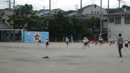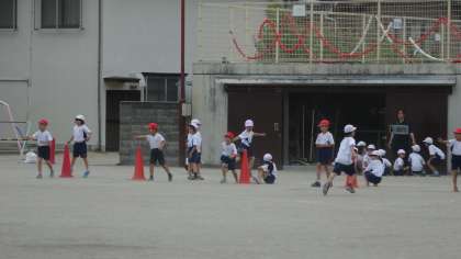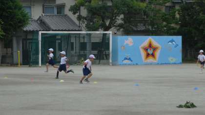 今日は1組が運動場で折り返しリレーをしました。チームで力いっぱい競い合うことができました。