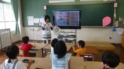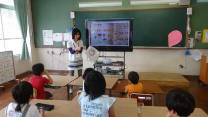 リズム打ちをして楽しみました。ことばに合わせて,手拍子をします。先生の話を聞きながら,みんなで楽しく学習しています。