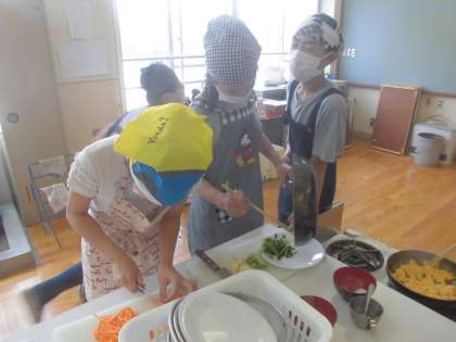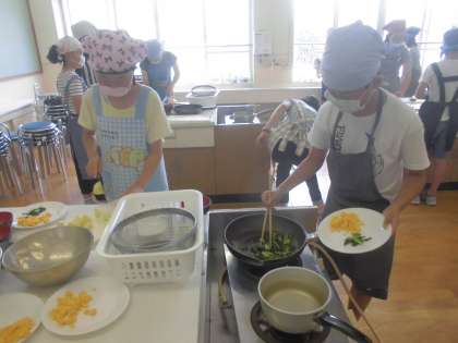 今日は1組が調理実習です。計画に基づいて,グループで協力して調理を進めていきました。