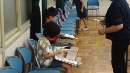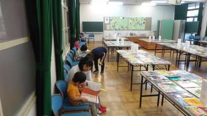 最初はなずな学級が選書会に来ました。たくさんの本の中ら思い思いに本を手にとって読んでいました。いい本は選べたかな。