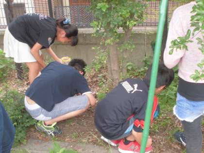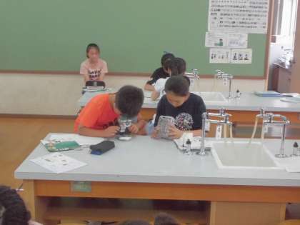 「生物どうしの関わり」の単元の学習をしています。今日は食べ物を通して生物どうしの関わりについて学習しました。子どもたちはダンゴ虫を集めて,ダンゴ虫が枯れた葉を食べることについて調べています。集めたダンゴ虫を理科室に戻ってから双眼実態顕微鏡で観察しました。