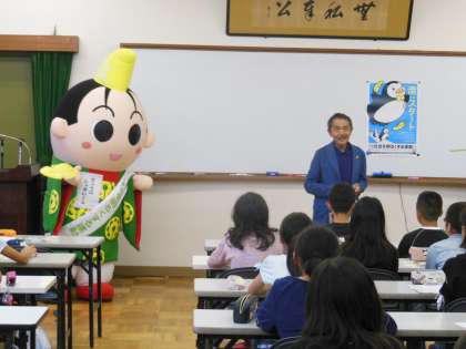 今日は,左京の保護司会の方に来ていただき,社会を明るくする運動について教えていただきました。しゃめい君も登場して,子ども達は喜んでいまいた。保護司の方が話し始めると真剣に耳を傾け,自分たちには何ができるだろうかと考えながら聞いていました。