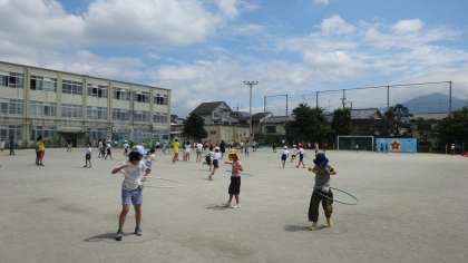 今日は暑い一日になりましたが,外で元気に遊ぶ姿もたくさんありました。フープを使って遊んだり,クラスのみんなで大縄をしたりと,思い思いに休みに間を楽しんでいます。