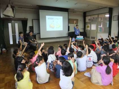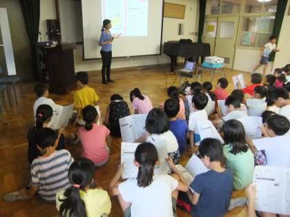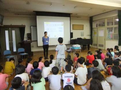 4年生は夏休みにエコライフにチャレンジします。ゲストティーチャーをお招きして,最近の環境問題の現状を教えていただきました。そして一人一人ができる環境にやさしい生活とはどんなものかをみんなで考えました。