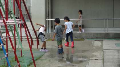ここ数日,天気がすっきりしない日が続いています。雨が上がった時には,水たまりに入って遊んだり,運動場を走ったりと,つかの間の外遊びを楽しんでいました。