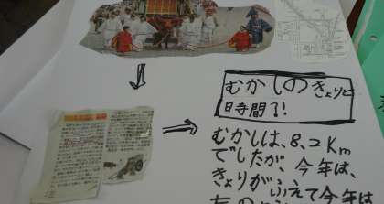 下鴨神社で葵祭を見学した3年生。葵祭について調べたことをまとめています。