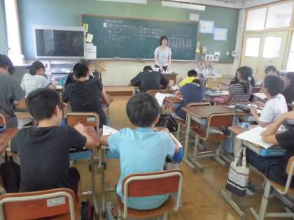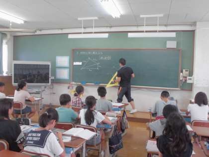 拡大と縮小の学習をしています。1組は拡大図と縮図をかきました。2組は拡大された図を見比べて拡大縮小の意味を学習しました。