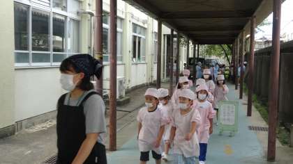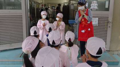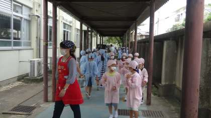 各クラス,一週間ごとに給食当番を交代でしています。週初めの月曜日,マスクもしっかり身に付けて,給食室に当番がやってきました。毎日,しっかり身支度をして,給食当番をお願いします。