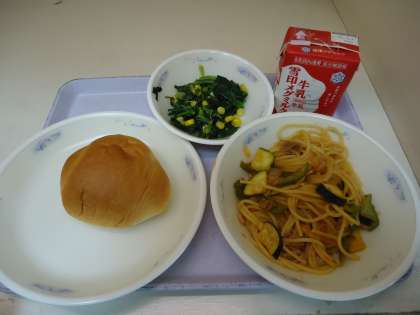 今日の献立は「バターテーブルロール・牛乳・イタリアンスパゲティ・ほうれん草のソテー」でした。小型コッペパンをバターテーブルロールに変更しました。イタリアンスパゲティは,夏野菜のピーマンやズッキーニをベーコン・たまねぎ・ホールトマト・にんにくと一緒に炒めて作りました。「スパゲティ,あまくておいしい。」「ズッキーニって初めて食べたけどおいしいね。」など感想を言ってくれました。これからもいろいろな食べ物と出会ってほしいです。
