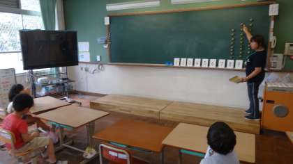 1年生は4人で学習です。暑さで少し疲れ気味でしたが,先生のお話をしっかり聞いて,わかることは元気に答えていました。