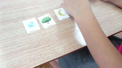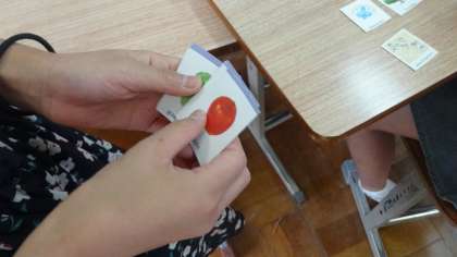 教科書を使って学習しています。カードを使ってゲームもしています。どんな学習をしているのか,5年生たちが教えてくれました。