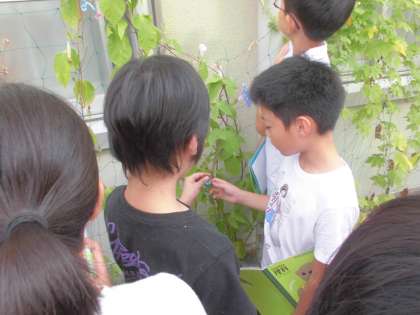 植物の実や種子のでき方の学習をしています。10日ほど前に「受粉をすると実ができるか」についてアサガオのつぼみからおしべをピンセットで取り除いて実験を開始しました。一週間たって受粉したアサガオと受粉していないアサガオがどのようになっているかを調べました。受粉したアサガオは実ができていましたが,受粉していないアサガオは実ができていませんでした。