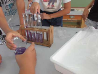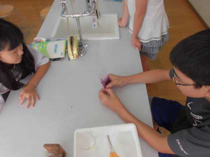 ムラサキキャッベツ液を使って水溶液を調べました。まず凍らせたムラサキキャベツを袋に入れてよくもんで液を作りました。その液に水を足して試験管に入れました。次に試験管に調べる水溶液を入れて色の変化を確かめました。水溶液を入れると紫色から色が変わり,子どもたちは驚きの声を上げていました。