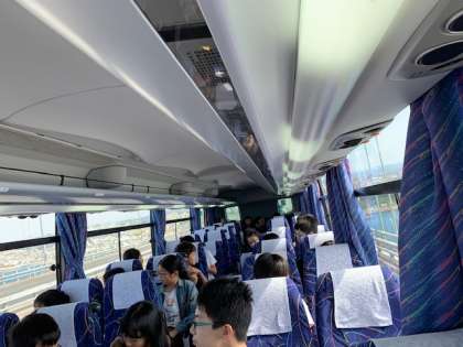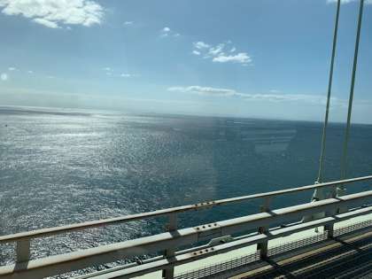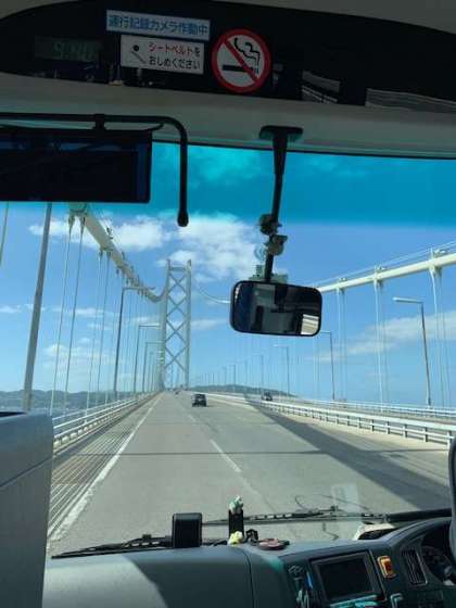 明石海峡大橋を通過中です。絶好の天気です。予定通りバスは進んでいます。