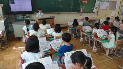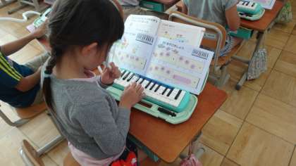 1組では,先生の伴奏に合わせて鍵盤ハーモニカの練習です。きれいな音が出せるようになってきました。指をどの鍵盤に置いたらいいか確認しながら,みんなで練習していました。