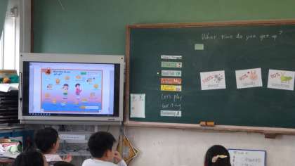外国語活動の時間の様子です。朝食に何を食べたか,英語でお互いに聞いていきました。