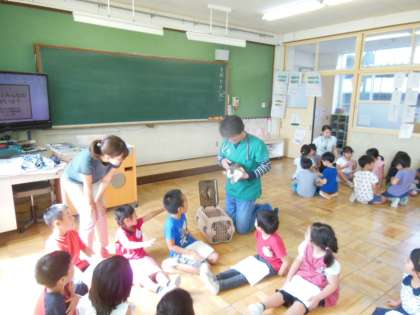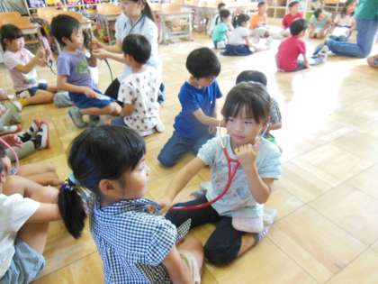 今日は,せな動物病院の方に来ていただき,ウサギとのふれあい体験を行いました。病院長さんにも来ていただき,ウサギを抱っこしたり,なでたりと恐る恐る触っている子もいれば,慣れた手つきで触っている子もいました。また,聴診器の使い方を教えてもらう時に,自分や友達の鼓動を聞くと「どくどく言ってる!」と驚いている様子でした。
