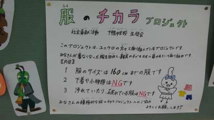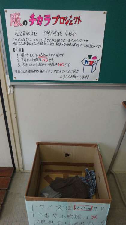 小中連携の取組で,下鴨中学校の生徒会より「服のチカラプロジェクト」への協力依頼がありました。昨年度も取り組みましたが,今年度もできましたらご協力よろしくお願い致します。