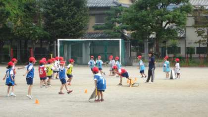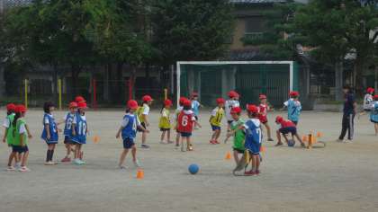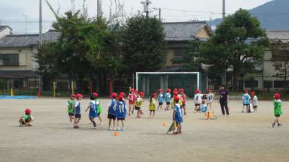 チームを組んで,対戦しながらボールあそびを楽しんでいます。ゲームの最初と最後には,元気のよい挨拶の声が聞こえてきます。元気いっぱいの1年生です。