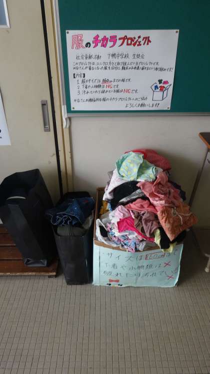 小中連携の取組「服のチカラプロジェクト」。もう段ボール箱いっぱいになりました。ご協力ありがとうございます。