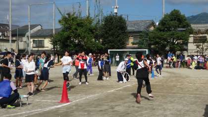 大人の部のリレーでは,中学生以上がバトンをリレーしていきます。大人の方々のスピード感はさすがに迫力があります。