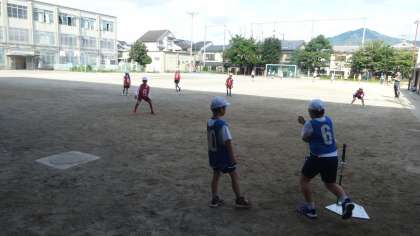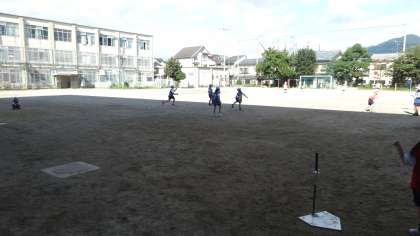 体育ではハンドベースボールをしています。今日は暖かな日差しのもと,みんなで声を掛け合いながら元気にプレーしていました。