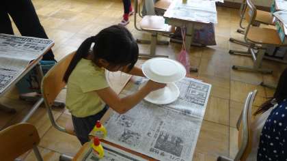 「コロコロゆらりん」の学習です。紙皿と紙コップを組み合わせて,今日は基本の形を作りました。これからどんな作品に仕上がっていくのか楽しみです。