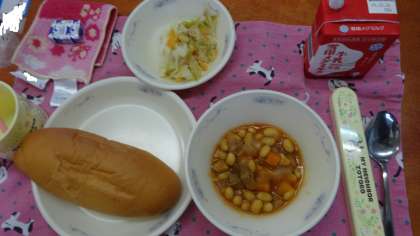今日の献立は,「味つけコッペパン・牛乳・ポークビーンズ・ツナとキャベツのソテー・チーズ」でした。今日はなかよし運動会で体を動かした分,いつも以上に美味しくいただくきました。