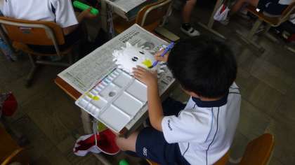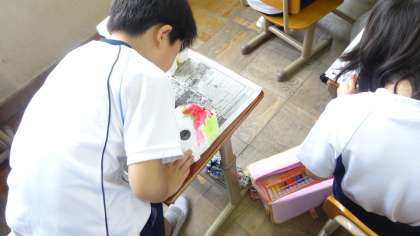 お面を作っていますが,今日から絵の具を使って色を塗っていきました。真っ白のお面が,どんどんカラフルになっていきます。みんな黙々と取り組んでいました。
