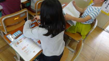 ひき算の学習が始まっています。たし算の時と同様に,数図ブロックを操作しながら考えています。