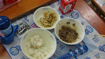 今日の献立は,「麦ごはん・牛乳・肉じゃが・切干大根の三ばい酢・じゃこ」でした。肉じゃがは人気メニューの一つです。みんなしっかりといただきました。