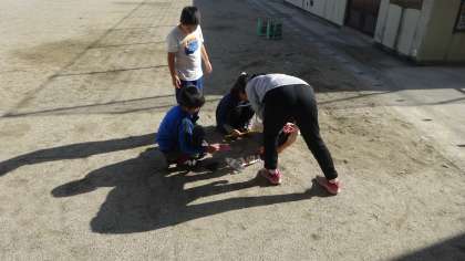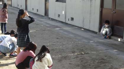 太陽の光を鏡で反射させたり,地面の温度を測ったりして,太陽の光について調べています。今日は絶好の天気のもとで学習ができました。