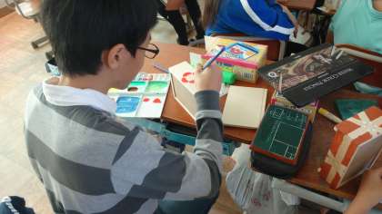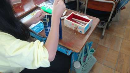 オルゴールボックスを製作しています。思い思いにデザインをして,絵の具で色を塗っています。
