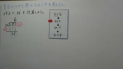 1組では,商の見当をつけながら割り進んでいく方法について学習しました。「たてる・かける・ひく・おろす」の順に沿って,計算をしていきました。