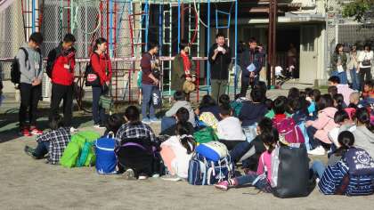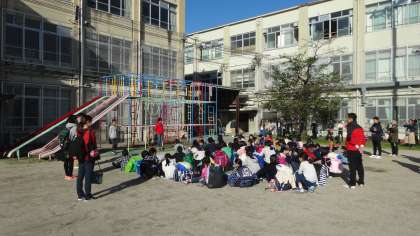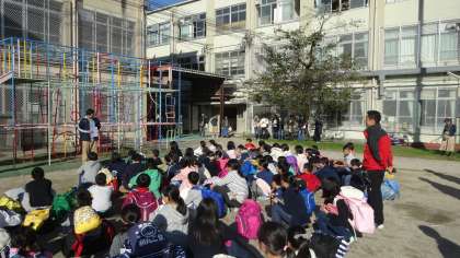 5年生は今日から3泊4日の長期宿泊学習で,花背山の家に行きます。まずは運動場で出発式です。