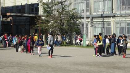 大勢のお家の方々,そして6年生にも見送られて,いよいよ出発です。元気に行ってきます。
