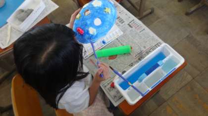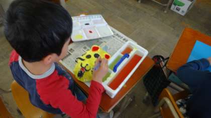 お面作りも大詰めを迎えています。色を細かく塗ったり,粘土をつけ足したりして,完成を目指しています。