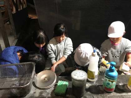 片付けもグループで協力して行います。日も落ちて辺りは暗くなり,水はとても冷たいです。