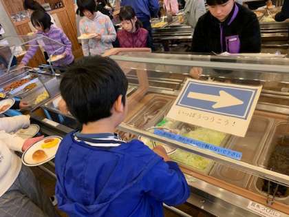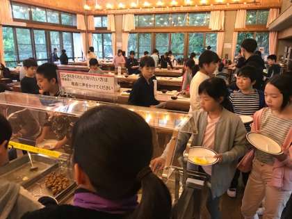 山の家の食堂で朝食です。食堂はバイキング形式になっています。栄養のバランスを考えて,それぞれ思い思いにお皿に盛りつけていきます。